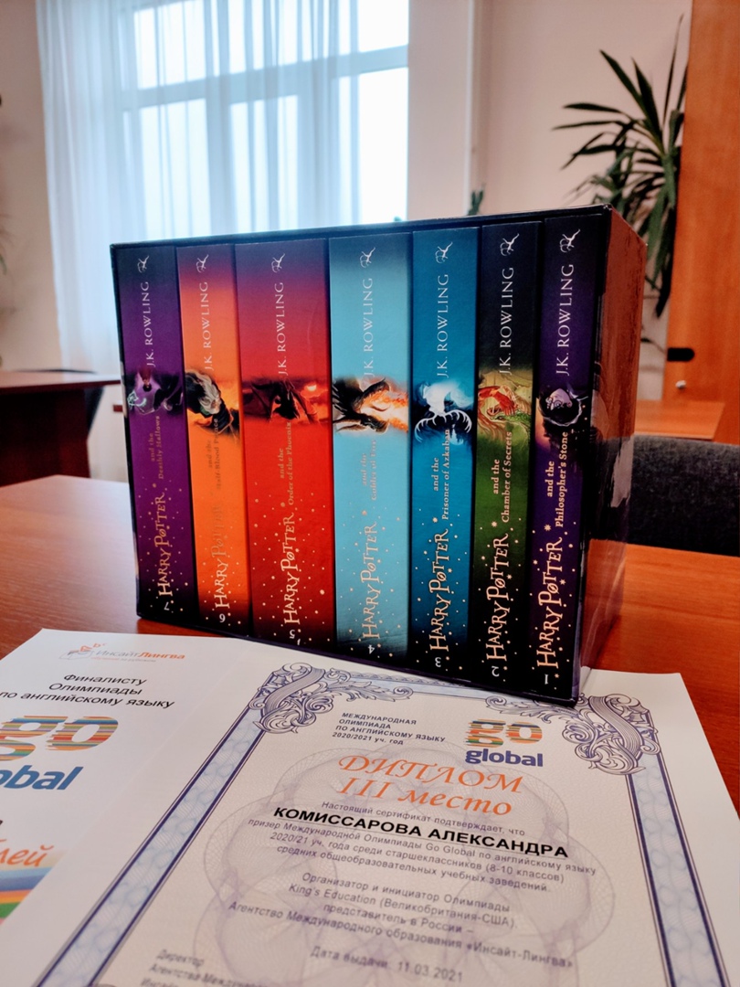 Она заняла III место и получает приз полное собрание книг «Harry Potter» на английском языке. Она большая молодец, ведь в отборочном туре приняли участие более 1100 человек, среди них во второй тур прошли только 200 (из них 4 наших), а в финал — только 16 ребят. В финале Александра выступала с 10 минутной презентацией на тему «What is gender equality?» (Что такое гендерное равенство?).