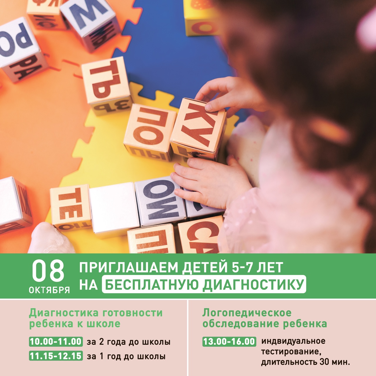 8 октября мы приглашаем детей от 5 до 7 лет на бесплатную диагностику готовности ребёнка к школе и консультацию логопеда.